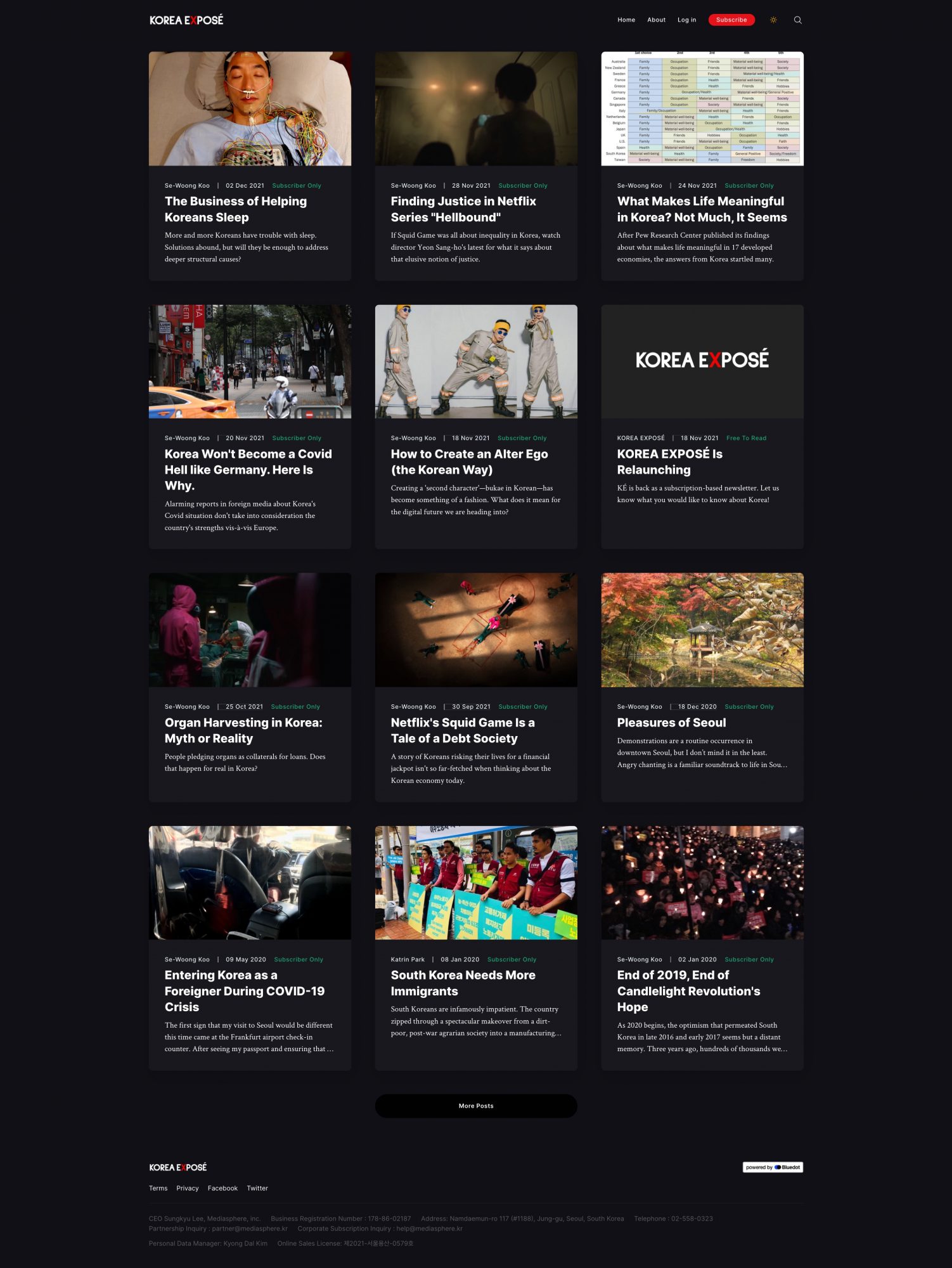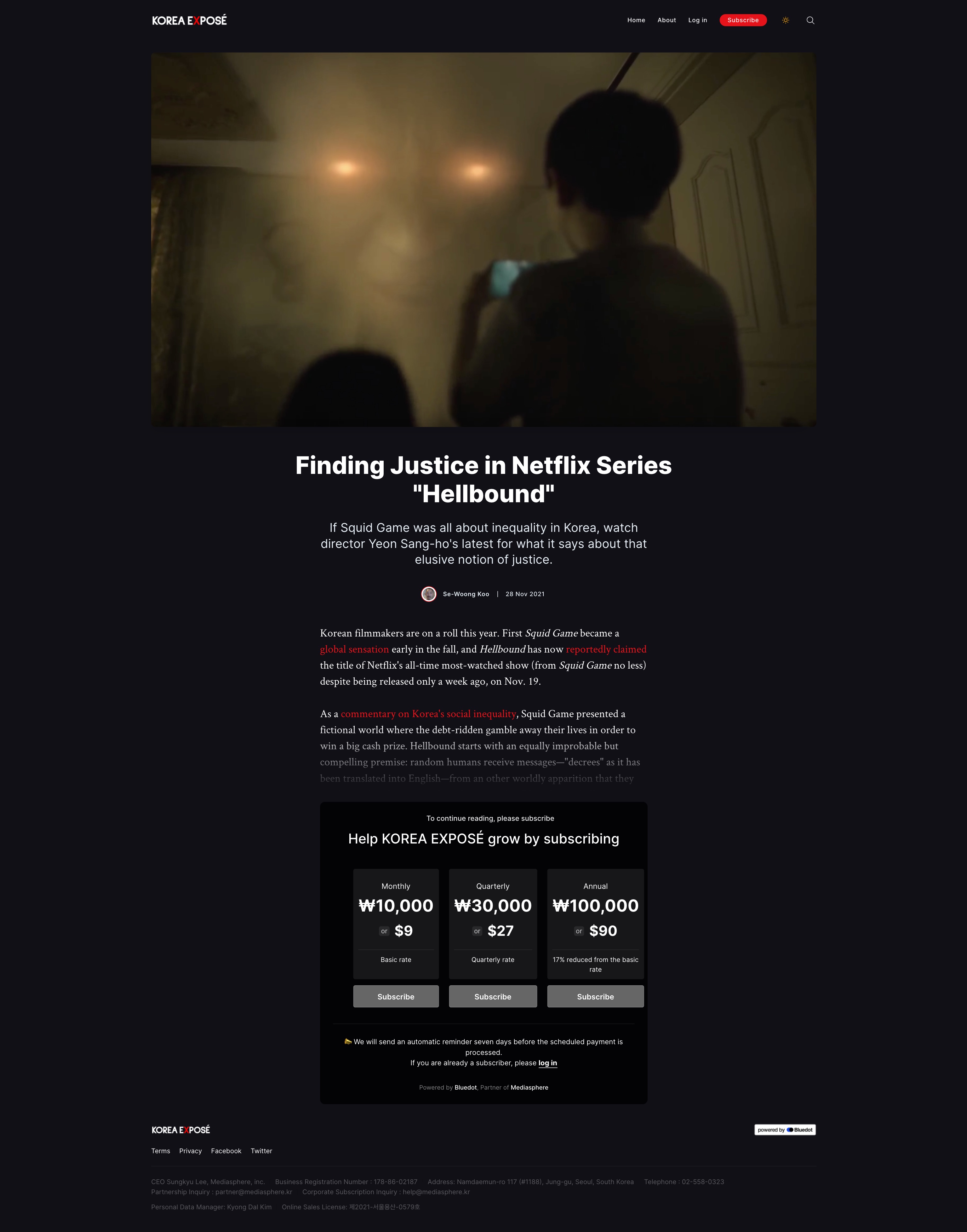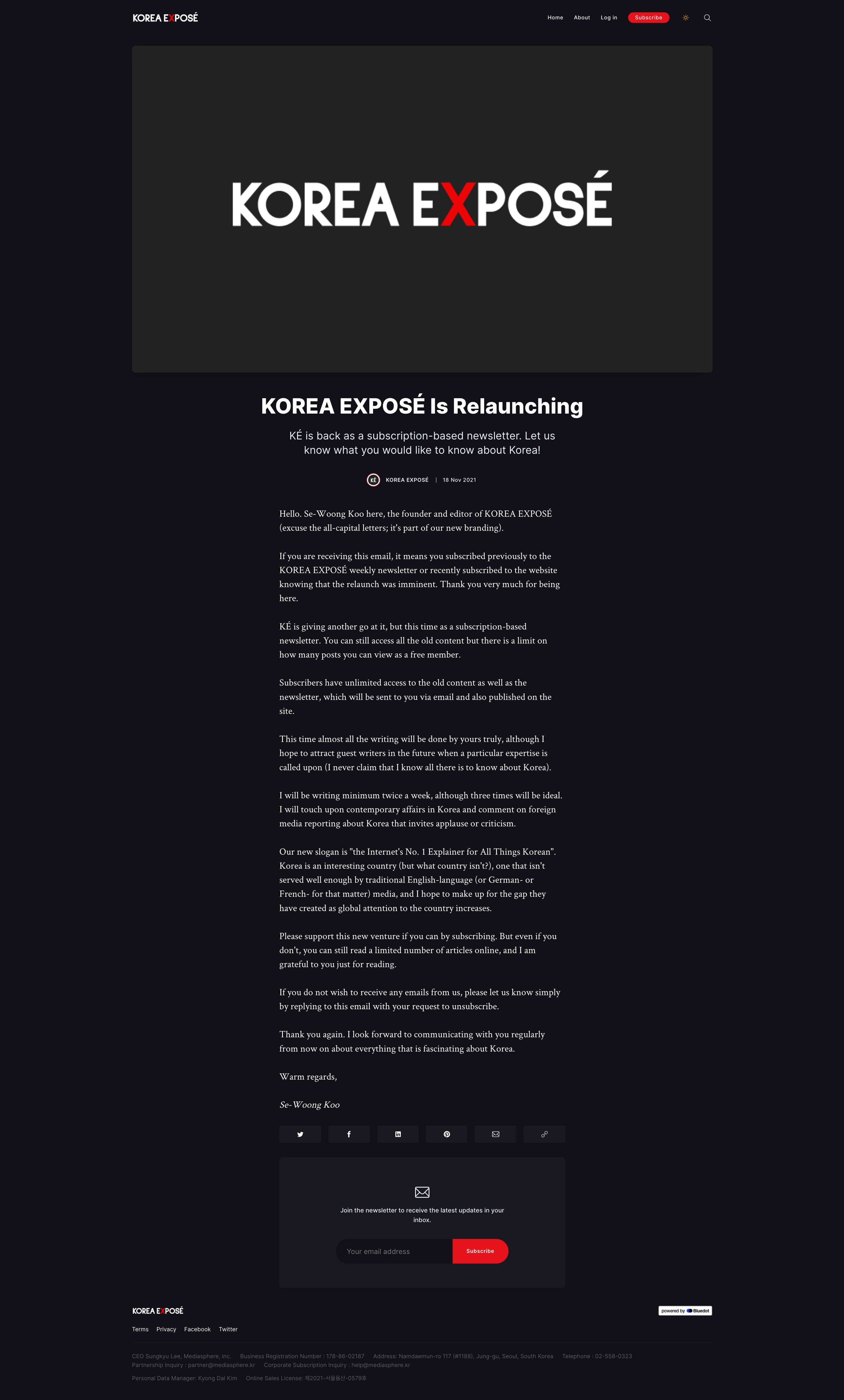 한국 사회에 대한 영문 설명 미디어 코리아 엑스포제(KOREA EXPOSÉ)의 콘텐츠 구독형 홈페이지를 제작했습니다.